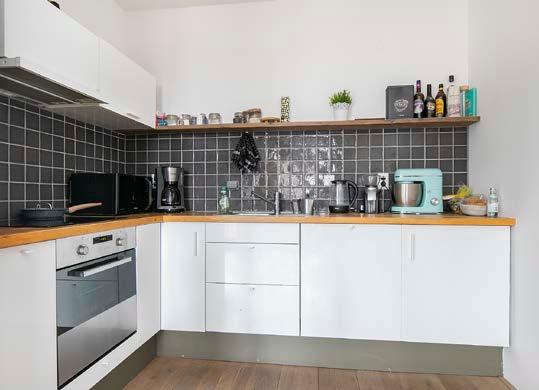 Aan het einde van de hal bevindt zich de heerlijk lichte woonkamer. De dubbele openslaande deuren met Franse balkons zorgen voor aangenaam veel lichtinval. Het geheel is keurig afgewerkt en strak gestucte wanden. Er is genoeg ruimte voor een fijne zithoek en een gezellige eethoek bij de open keuken.