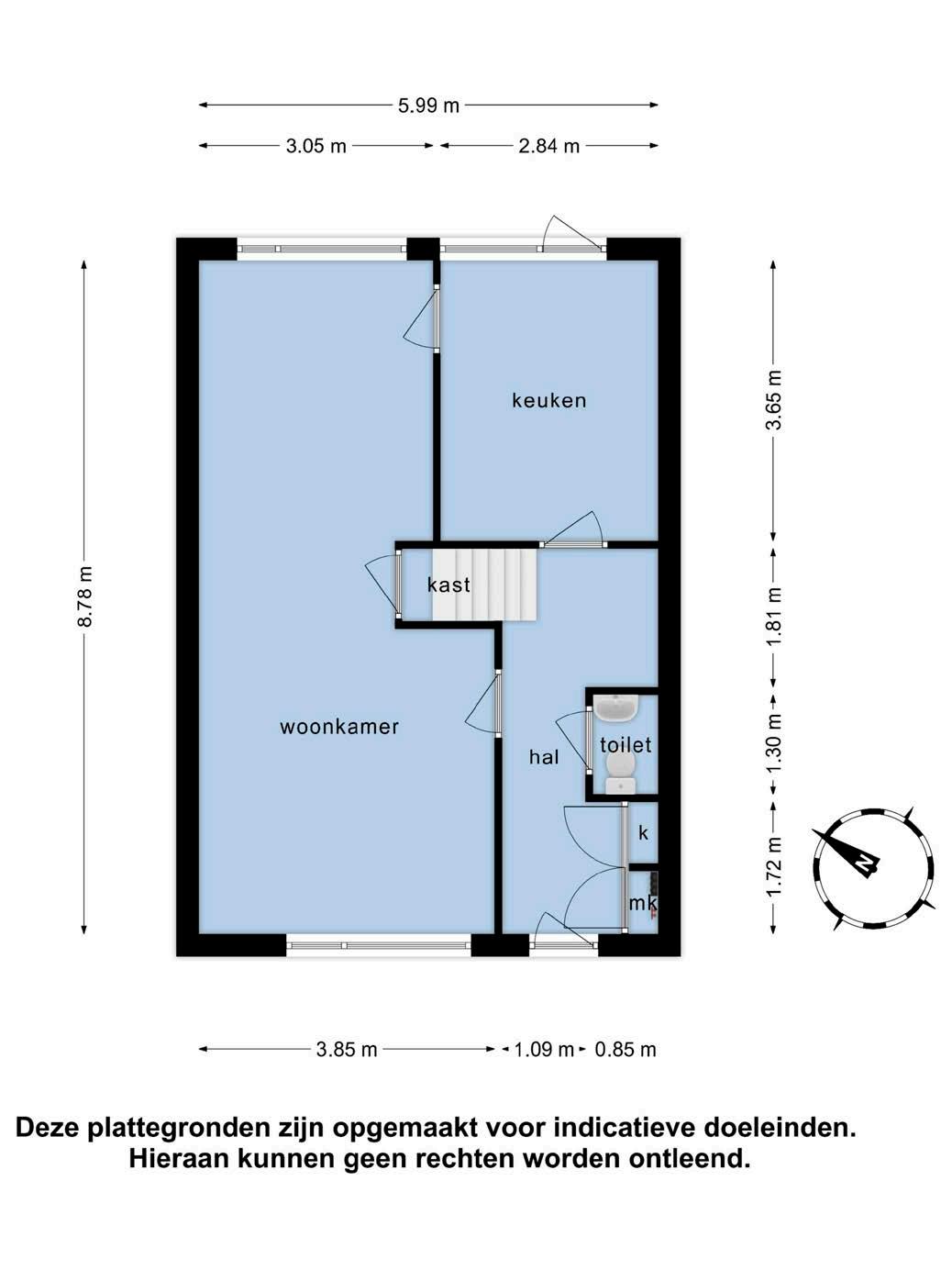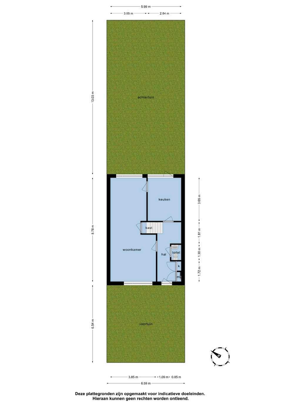 Entree, gang met meterkast, bergkast en het toilet met een fonteintje. Vanuit de gang komt men in de lichte doorzon woonkamer. De woonkamer heeft een ingebouwde trapkast, een schouw en is zeer licht door de grote raampartijen aan zowel de voorals achterzijde. De gesloten keuken aan de achterzijde heeft geen keuken en kan dus nog naar eigen wens worden geplaatst. De keuken heeft een deur naar de achtertuin.