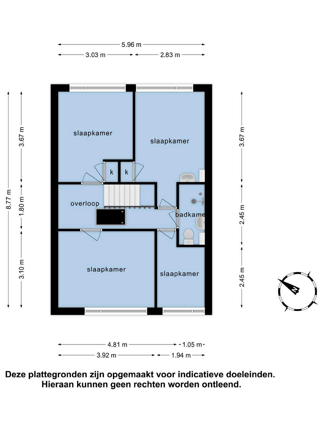 Eerste verdieping: Overloop en vier slaapkamers. De inpandige, eenvoudige badkamer is voorzien van een douche, wastafel en tweede toilet.