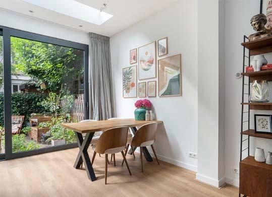 De open woonkeuken is van alle gemakken voorzien. Het ruime kookeiland is niet alleen praktisch, maar ook een echte eyecatcher. Dankzij de grote schuifpui stroomt het zonlicht rijkelijk naar binnen, waardoor de ruimte altijd baadt in een warme gloed. In de lente en zomer vormen de opengeschoven pui en de tuin één geheel, waardoor je zowel binnen als buiten kunt genieten van het prachtige weer.