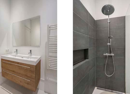 De moderne badkamer is volledig betegeld en uitgerust met een ruime inloopdouche, een dubbel wastafelmeubel en een designradiator.