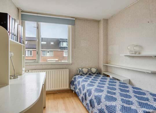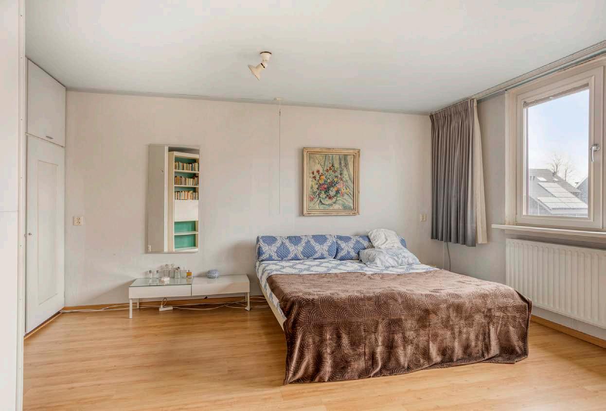 Aan de achterzijde van de woning bevindt zich een zeer ruime slaapkamer die zich over de gehele breedte van de woning uitstrekt. Deze kamer bestond oorspronkelijk uit twee slaapkamers en biedt daardoor extra ruimte en verschillende indelingsmogelijkheden.