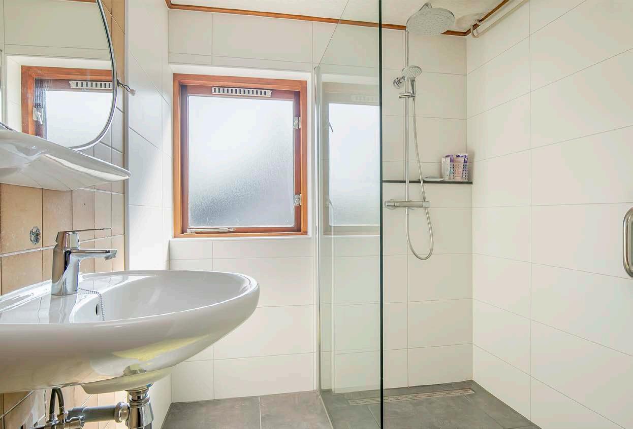 De functionele badkamer is circa 2 jaar geleden gerenoveerd en uitgerust met een douchecabine en een wastafel.