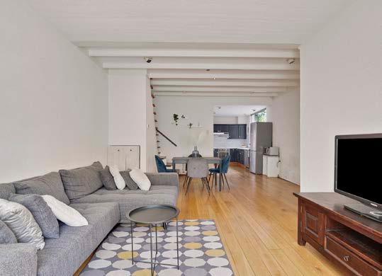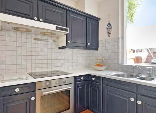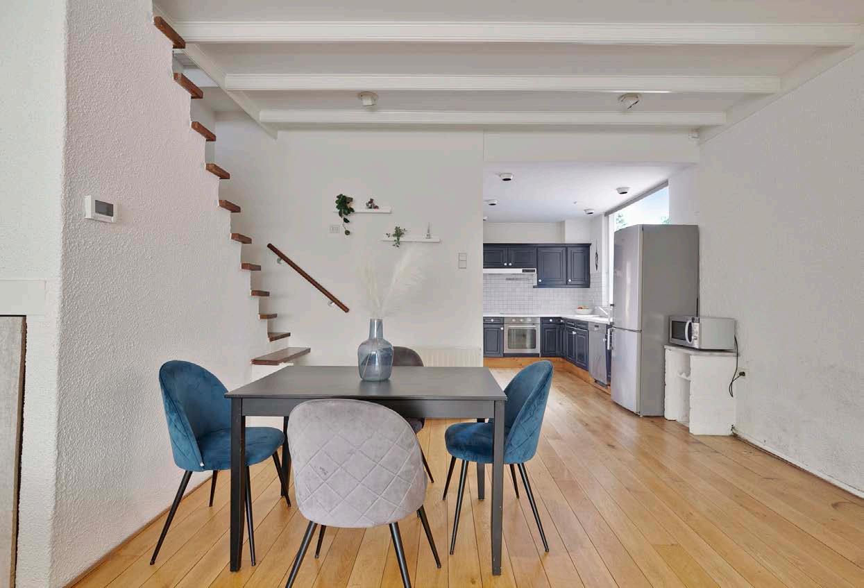 De open verbinding met de keuken creëert een ruimtelijk gevoel. Hier kunnen vrienden en familie samenkomen. De keuken is voorzien van moderne inbouwapparatuur, wat etentjes bereiden tot een genot maakt.