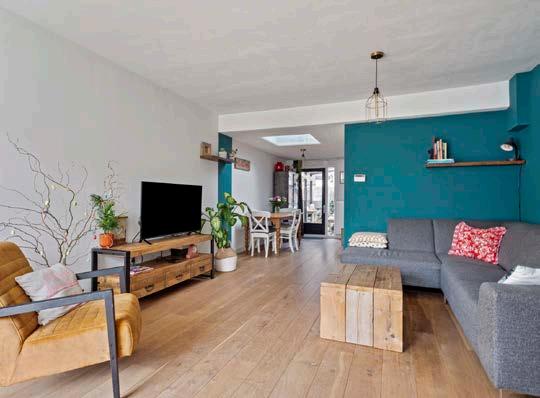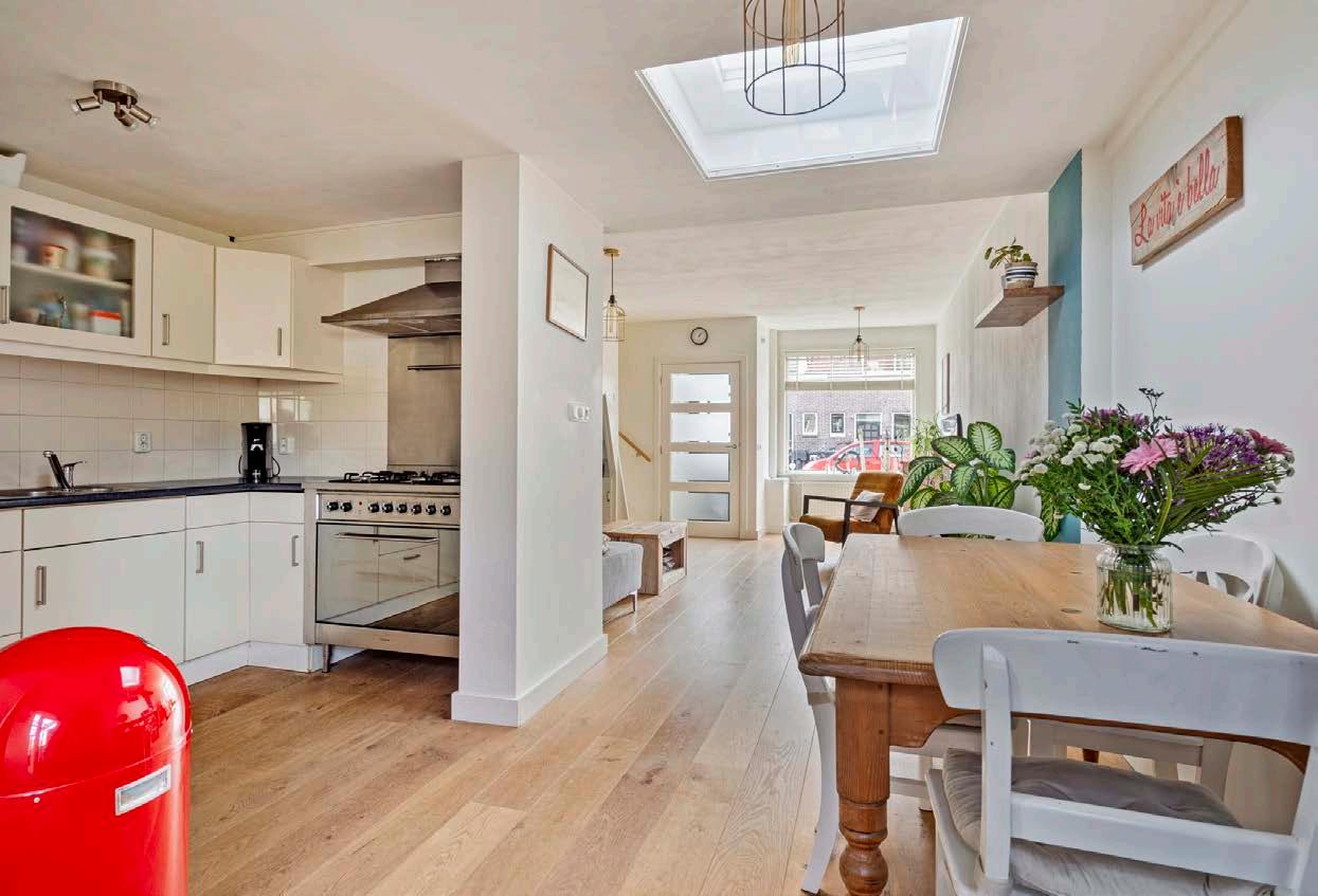 De woonkamer is dankzij een slimme uitbouw verrassend ruim en licht. De lichtkoepel zorgt voor een natuurlijke lichtinval die de kamer een open en uitnodigende sfeer geeft. Het is de ideale plek om gasten te ontvangen of om te ontspannen met een goed boek en een kopje thee. De extra ruimte biedt talloze mogelijkheden voor inrichting en decoratie.