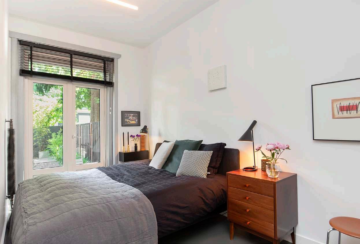 De benedenwoning is uitgerust met twee slaapkamers. Beide slaapkamers zijn gelegen aan de achterzijde, zijn prima van formaat en voorzien van veel lichtinval. De grootste slaapkamer is voorzien van openslaande deuren naar de achtertuin. De tweede slaapkamer beschikt over een kast met de cv-ketel en een praktische inbouwkast. Ook de slaapkamers zijn afgewerkt met strakke wanden en een marmoleum vloer.