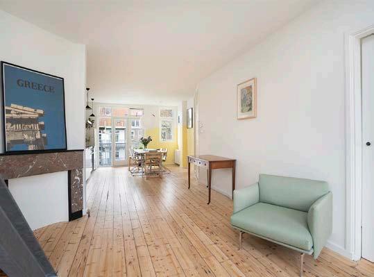 De woonkamer heeft karakteristieke details met op de vloer mooie houten planken, paneeldeuren en een prachtige schouw. Aan de voorzijde bevinden zich twee hoge ramen die zorgen voor rijkelijk lichtin val en zicht op de woonomgeving. De lichte uitstra ling wordt versterkt door het strakke stucwerk in een frisse witte kleur op de wanden.