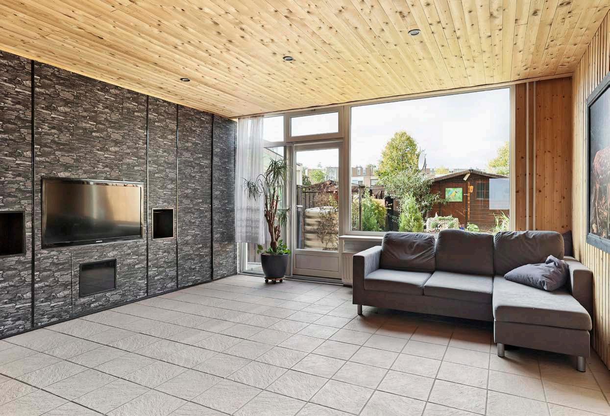 Vanuit de entree kom je binnen in de woonkamer. Hier word je verrast door een aangename hoeveel heid daglicht dankzij het grote raam en de deur naar de tuin. Daarnaast is de ruimte voorzien van een plavuizenvloer en houtwerk op de wand en het plafond. Hier kun je een meer dan fijn thuis van maken precies zoals jij dat voor je ziet.