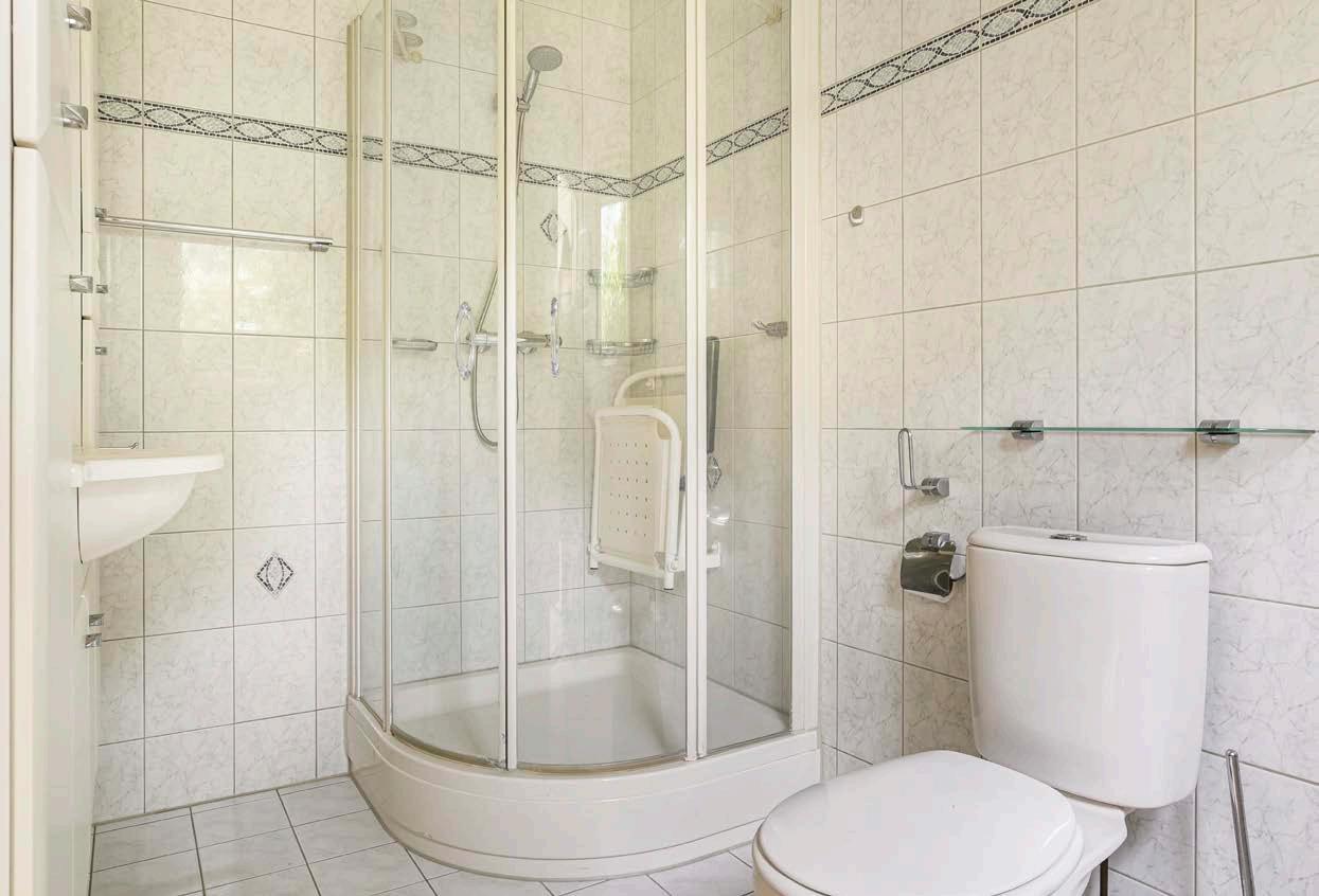 De badkamer is vanuit de keuken bereikbaar en voorzien van een douchecabine, wastafelmeubel en toilet. Ook heb je hier de aansluiting voor de wasmachine en raam voor lichtinval en natuurlijke ventilatie.