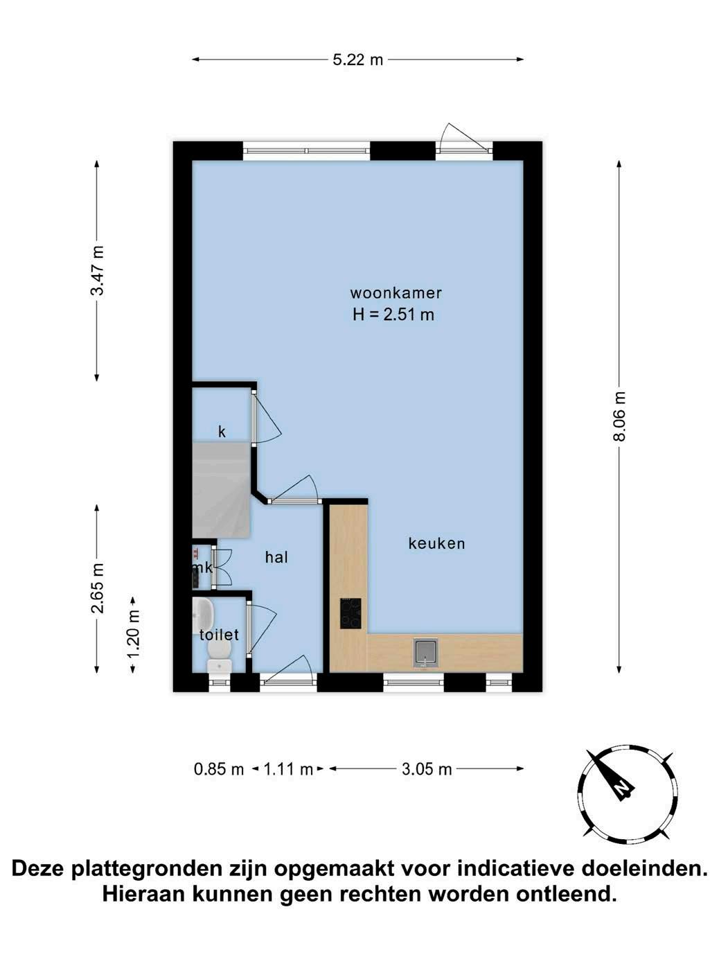 De open keuken is praktisch en voorzien van een gaskookplaat. Er is genoeg ruimte voor het plaatsen van extra keukenapparatuur. Een ideale basis om een eigen draai aan de keuken te geven.