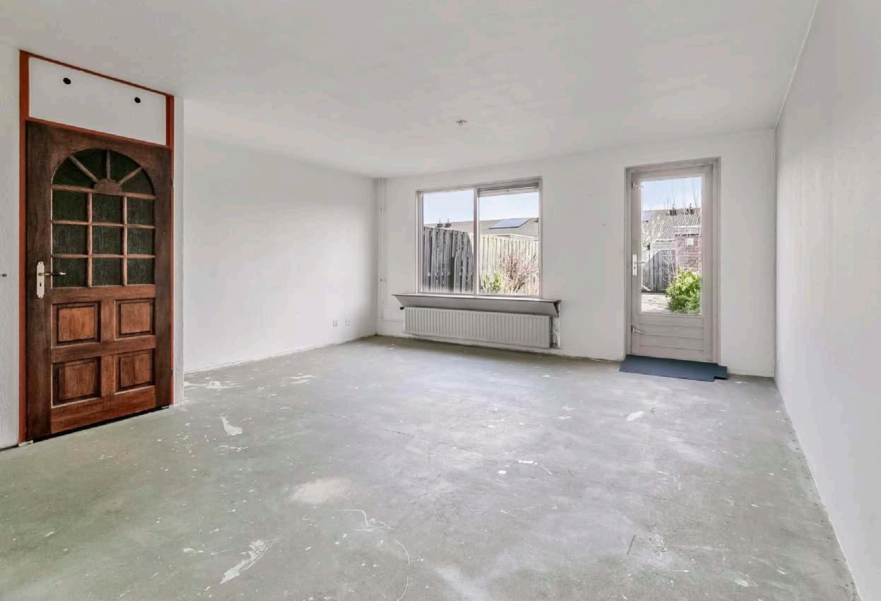 Een lichte woonkamer die ruimte biedt voor zowel een comfortabele zithoek als een eettafel. De grote ramen zorgen voor een prettige lichtinval en geven zicht op de tuin. Deze ruimte is klaar om naar eigen smaak ingericht te worden.