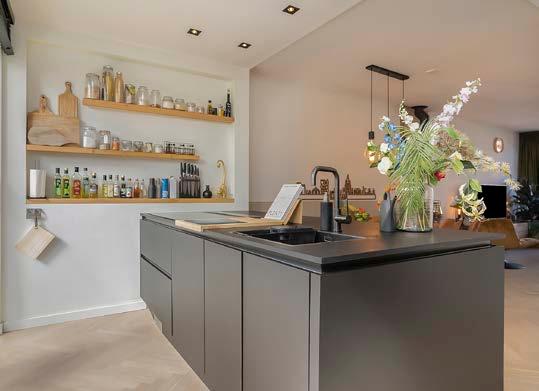 De keuken staat in open verbinding met de woonkamer. De gezellige woonkeuken is geplaatst in een los eiland en is uitgevoerd in een lichte en mat zwarte kleurstelling en is voorzien van diverse kasten en lades waardoor je ook aan werk- en opbergruimte niets te kort zult komen.