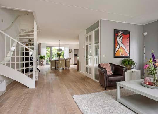 De woonkamer is licht en ruim dankzij de grote raampartijen. Dit zorgt voor een schitterend uitzicht op de rustige straat en laat volop natuurlijk licht binnen. Je kunt hier heerlijk ontspannen en genieten van het daglicht dat de kamer binnenstroomt. De grote ramen geven een open en uitnodigend gevoel, waardoor de woonkamer een plek is waar je graag tijd doorbrengt, of het nu is om te ontspannen of om gasten te ontvangen.