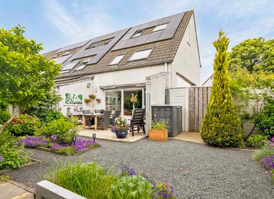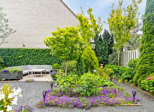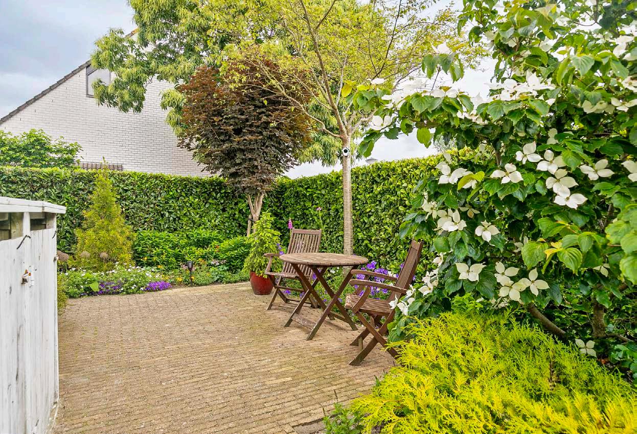 Vanuit de woonkamer heb je toegang tot de ruime en goed onderhouden achtertuin op het zuidoosten. Dankzij de hoekligging en extra aangekochte grond is de tuin bijzonder breed en biedt veel privacy. De tuin is voorzien van bestrating, grind, beplanting, een buitenkraan, buitenverlichting, 220v aansluiting in zowel de voor- als achtertuin en een zonnescherm wat het zowel praktisch als mooi maakt. Hier kun je heerlijk ontspannen, barbecueën met vrienden of gewoon genieten van de rust en het groen om je heen.