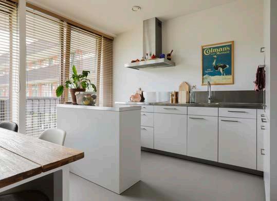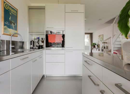 Grenzend aan het balkon met uitzicht op de bin nentuin, bevindt zich de keukenruimte met genoeg plek voor een grote eettafel waar vrienden en fa milie gezellig kunnen plaatsnemen. De keuken zelf heeft een moderne, neutrale uitstraling en bestaat uit een keukenblok in hoekopstelling en een eilandelement. Daarnaast is er natuurlijk ook gedacht aan de nodige inbouwapparatuur, zoals een 4-zones inductiekookplaat, afzuigkap, combi oven, vaat wasser en een koel-/vriescombinatie.