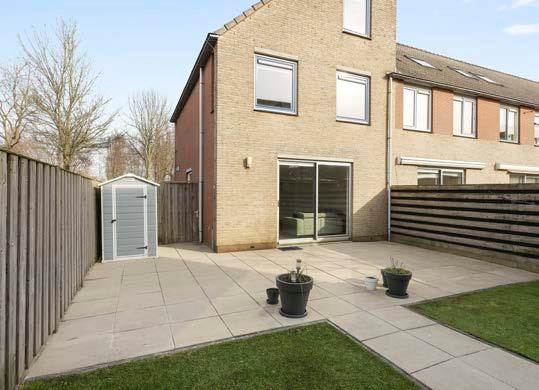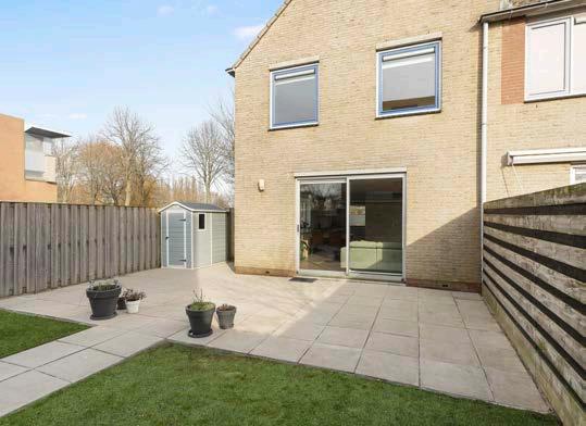Middels de schuifpui kom je vanuit de woonkamer in de achtertuin. De tuin is gelegen op het zuidwesten en keurig aangelegd. Zo vind je een combinatie van bestrating, groen en een vrijstaande houten berging. Daarnaast is er nog een kunststof berging voor extra opbergruimte en een buitenkraan.