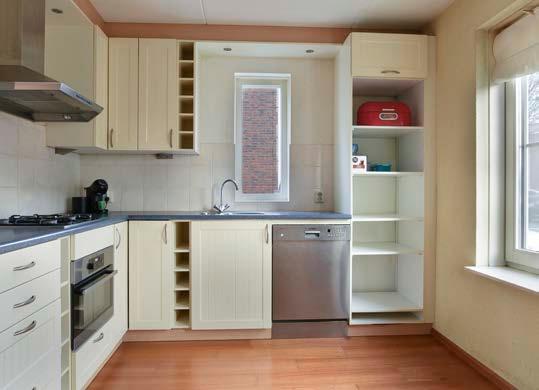 Aan de voorzijde van de benedenverdieping loopt de woonkamer over in de open keuken. Deze is eenvoudig ingericht met onder andere een gasfornuis, oven en vaatwasser.