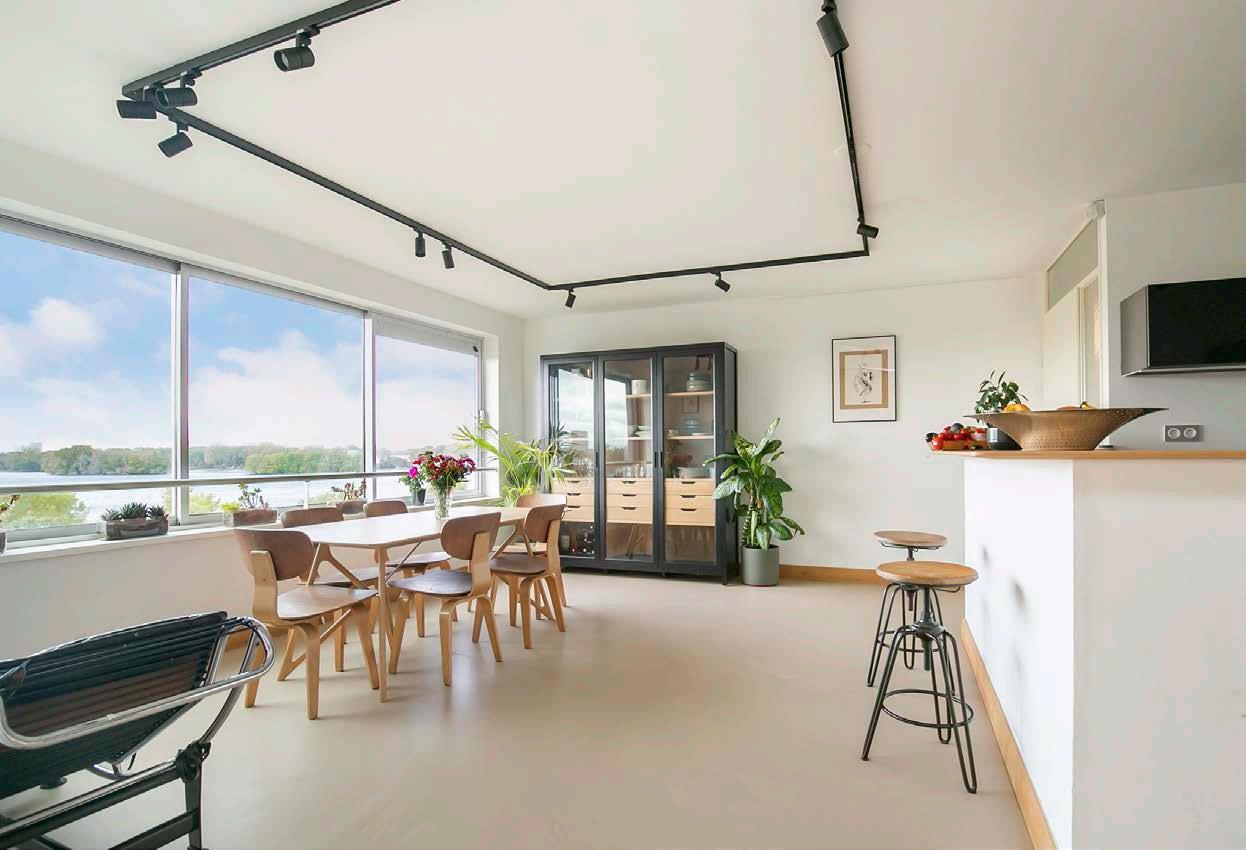 Vanuit de keuken is de gietvloer doorgetrokken naar de zeer ruime woonkamer. De woonkamer is beschikt ook over de vele raampartijen en is ruim 35 m2 groot, voldoende ruimte voor meerdere zitgedeeltes. Ook hier kunt u onder andere genieten van de ondergaande zon.