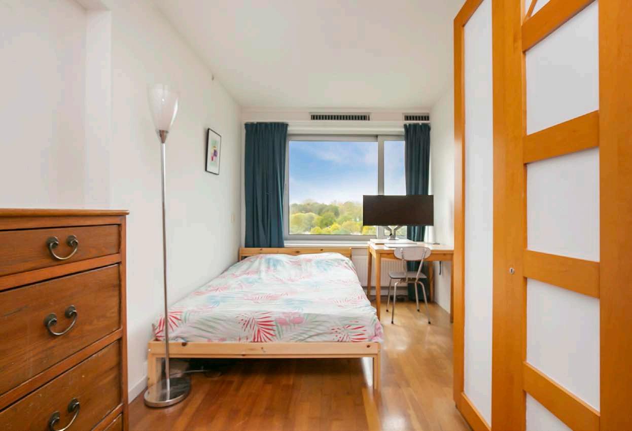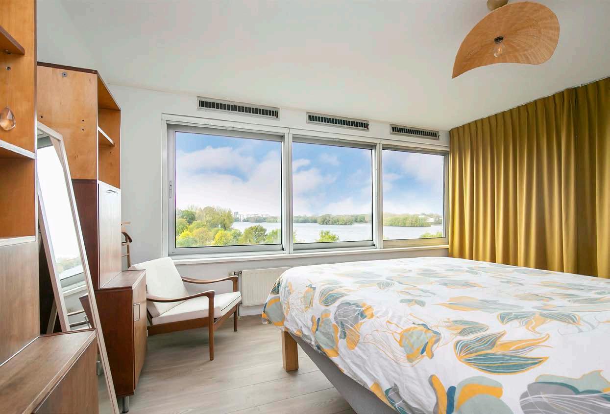 De hoofdslaapkamer is ruim 17m2 groot en voorzien van een brede opbergruimte achter een modern gordijn, strakke wanden en een laminaat vloer. Vanuit het bed hebt u uitzicht over de Sloterplas en is de slaapkamer verbonden met de moderne badkamer (2020).