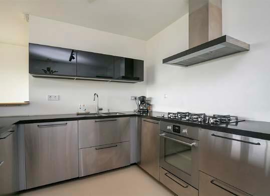 De open woonkeuken is in 2018 volledig vernieuwd en is voorzien van een 5-pits gasfornuis, circulatie afzuigkap, vaatwasser, combi-oven, oven en diverse lades en kasten. Het natuurstenen blad matched perfect met de RVS look kasten en lades. De keuken is middels een bar met een handgemaakt eikenhouten blad gescheiden van het eetgedeelte. Het eetgedeelte biedt ruimte voor een grote eettafel en zowel vanuit de keuken als het vanuit het eetgedeelte geniet u van het prachtige uitzicht. In de zomer kunt u de ramen over de gehele breedte openzetten.