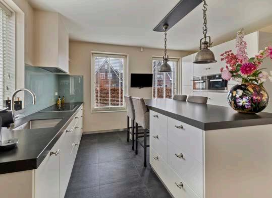 De open keuken is een droom voor iedere thuiskok. Met een stijlvolle witte afwerking en een donker werkblad is het een plek waar je graag tijd doorbrengt. Alle moderne apparatuur is aanwezig, van inductiekookplaat tot twee koelkastenvriezer. Koken wordt hier een feestje!