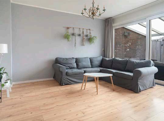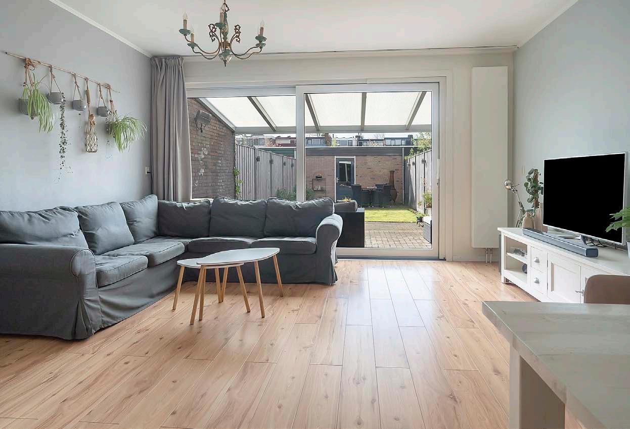 De tuingerichte woonkamer met schuifpui zorgt voor een naadloze overgang tussen binnen en buiten. Het is een ruimte waar licht en natuur samenkomen om een ontspannen sfeer te creëren.