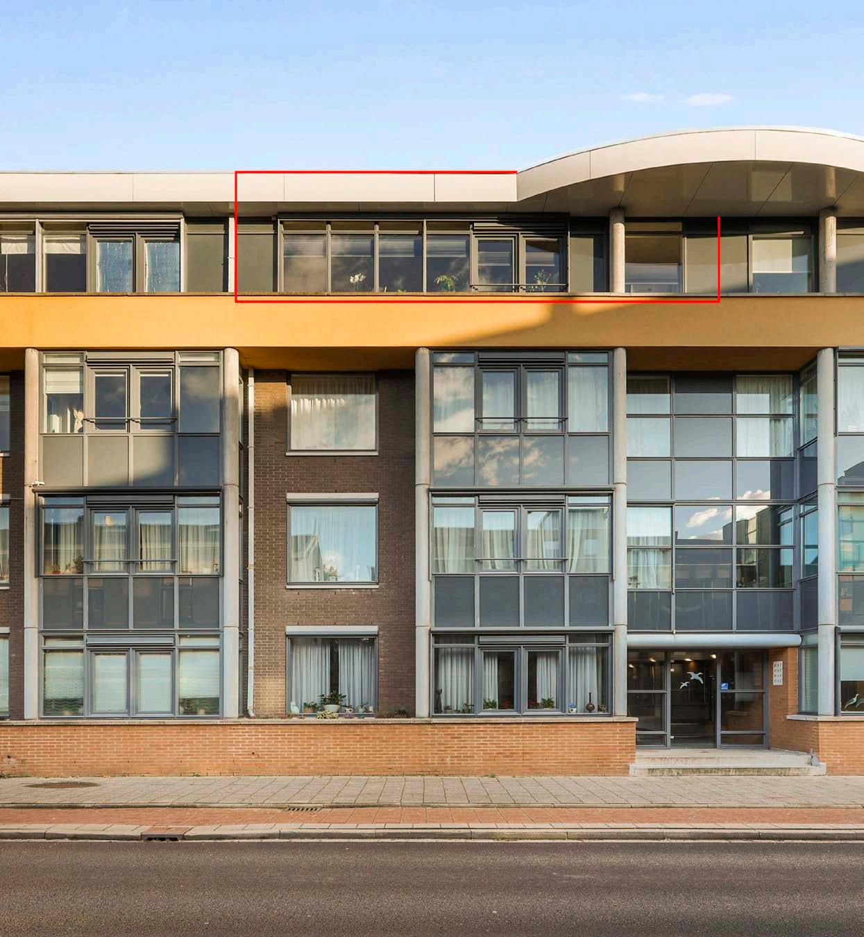 Ons oog viel gelijk op dit appartement vanwege zijn ruime living en en mooie raampartijen over de hele breedte van het appartement, dus veel lichtinval het is tevens het bovenste appartement wat mooi uitzicht geeft op het gemeentehuis.