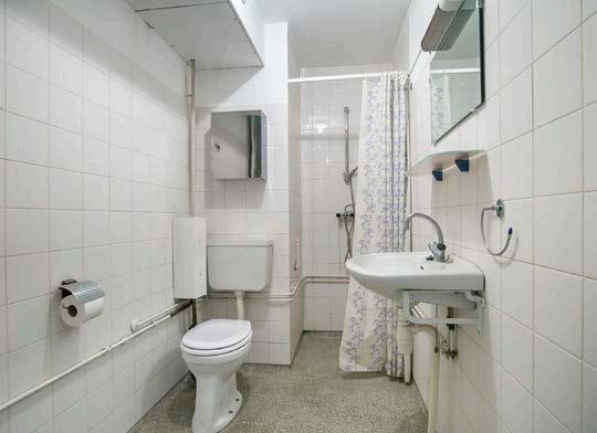 De badkamer is nog grotendeels in originele staat. De granito vloer en de witte tegels zijn weliswaar al een tijd terug geplaatst, toch zou de badkamer met een paar aanpassingen nog best wat jaren mee kunnen. Er is in deze ruimte een toilet, een douche en een wastafel.