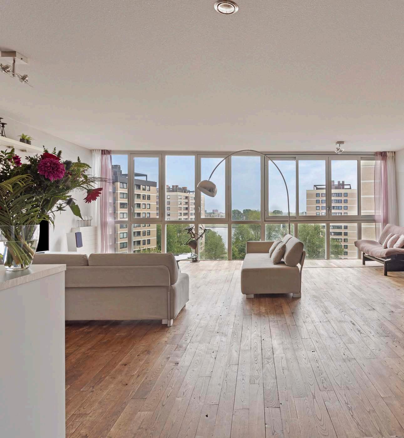 De grote ramen zorgen niet alleen voor een prachtige lichtinval, maar ook voor een ononderbroken uitzicht over de Sloterplas. Dit creëert een lichte en luchtige woonomgeving.
