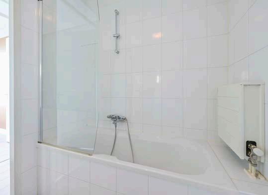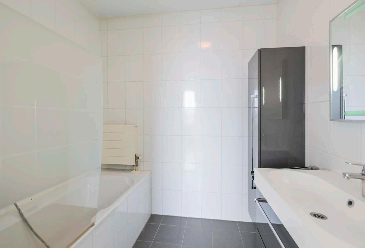 De badkamer, met strakke lijnen en een douche in bad, is een toonbeeld van comfort.