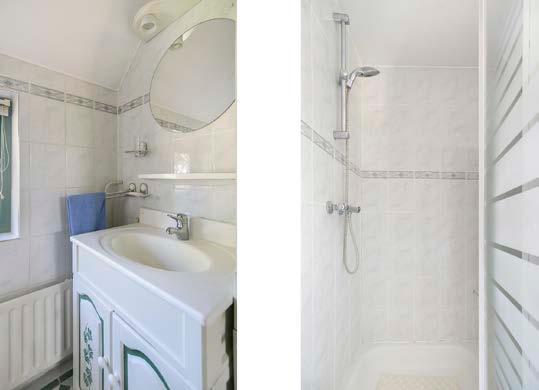 De badkamer is volledig betegeld en uitgerust met een douche, wastafelmeubel en een tweede toilet. De wasmachine staat momenteel in de slaapkamer aan de voorzijde, maar er bevindt zich ook een aansluiting in de badkamer.