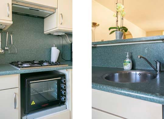 De keuken ligt aan de voorzijde van de woning en is voorzien van een eenvoudig L-vormig keukenblok, maar biedt voldoende ruimte voor het bereiden van heerlijke maaltijden.