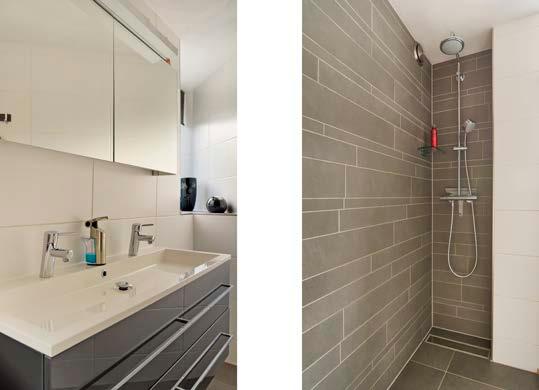 Kom verder naar de nette badkamer. De ruimte is volledig betegeld en voorzien van een inloopdou che, breed wastafelmeubel met kastenwand, toilet en een design radiator.