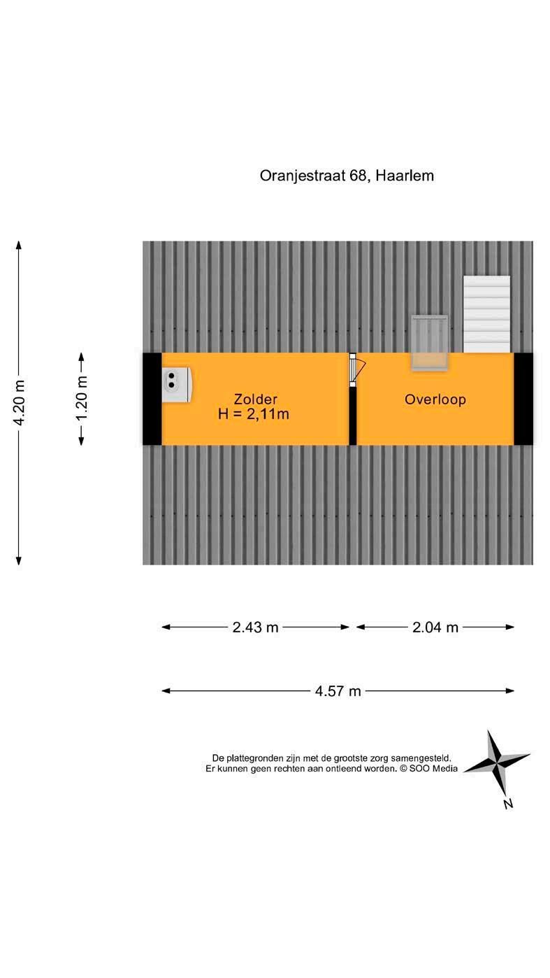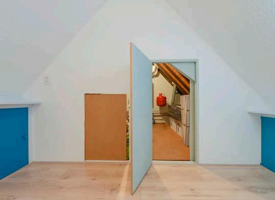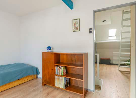 Via een steile trap kom je op de tweede verdie ping. Hier heb je toegang tot een bergruimte met de cv-opstelling. Je zou op deze verdieping de wanden recht kunnen optrekken en een opbouw kunnen plaatsen voor meer ruimte.