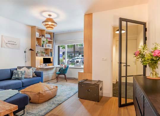Laten we beginnen in de lichte woonkamer, deze bevindt zich aan de voorzijde van het appartement. De strak gestucte wanden en mooie eikenhouten vloer geven de ruimte een moderne uitstraling. Hier is voldoende ruimte voor een gezellige zithoek waar je kunt ontspannen en genieten van je favoriete tv-programma’s. Tevens beschik je hier over een handgemaakt eikenhouten ingebouwd bureau met opbergplanken (in 2022 geplaatst), ideaal voor mensen die vanuit huis werken, deze kan ook weer makkelijk weggestopt worden wanneer de werkdag voorbij.