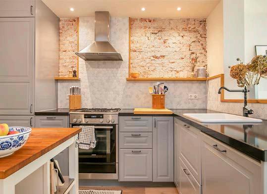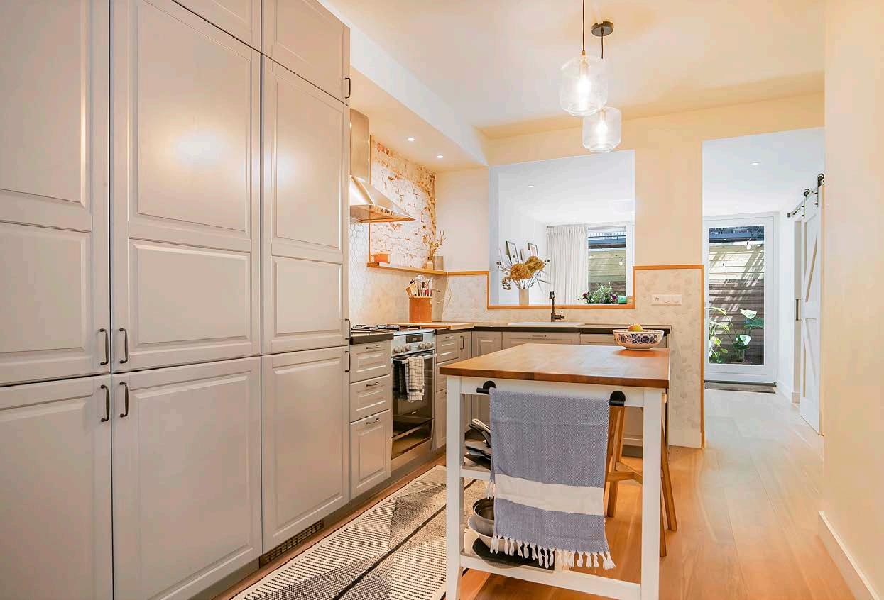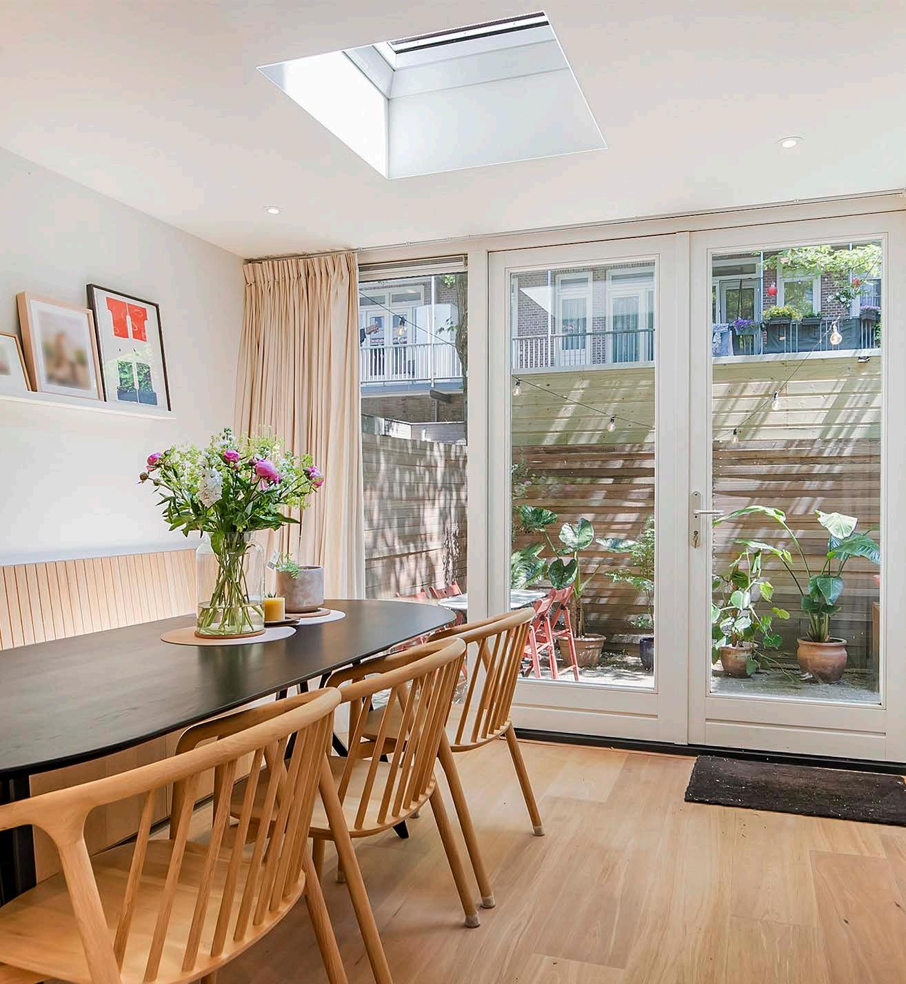 Aan de achterzijde van de woning bevindt zich de luxe open keuken met een kookeiland, grenzend aan de eetkamer. De keuken is voorzien van een 4-pits gasfornuis (Siemens), een afzuigkap, een koelvriescombinatie, een vaatwasser en voldoende kastruimte. Door de uit 2021 gerealiseerde uitbouw met groen dak en een dakraam is er een gelegenheid gecreëerd voor een fijn eetgedeelte met een ingebouwd handgemaakte eikenhouten bank (geplaatst in 2021) met ingebouwde opslagruimte aan de achterzijde van de woning. Vanuit de openslaande deuren kom je uit in de fijne tuin.