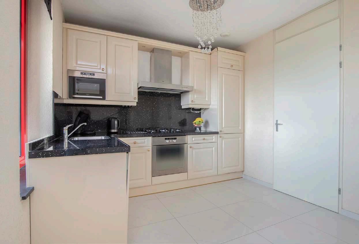 Vervolgens komen we in de open keuken die naadloos aansluit op het woongedeelte. Het geheel is geplaatst in een L-opstelling, uitgevoerd in een lichte kleur en biedt voldoende werk- en opbergruimte. Verder beschik je over diverse apparatuur, te noemen een oven, magnetron, koelkast koel/ vries combinatie, vaatwasser, 5-pits gaskookplaat en afzuigkap.