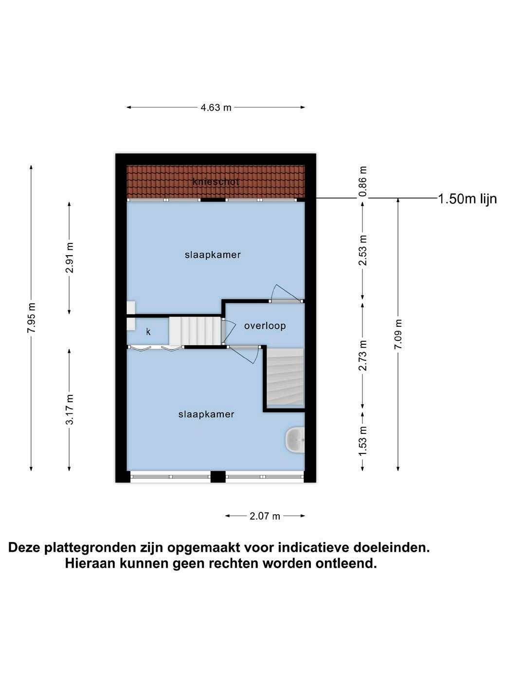 De overloop die toegang geeft tot twee slaapkamers. Beide slaapkamers zijn ruim te noemen. Één van de twee slaapkamers heeft een eigen wastafel en een inbouwkast. De andere slaapkamer is voorzien van handige knieschotten om spullen achter op te kunnen bergen
