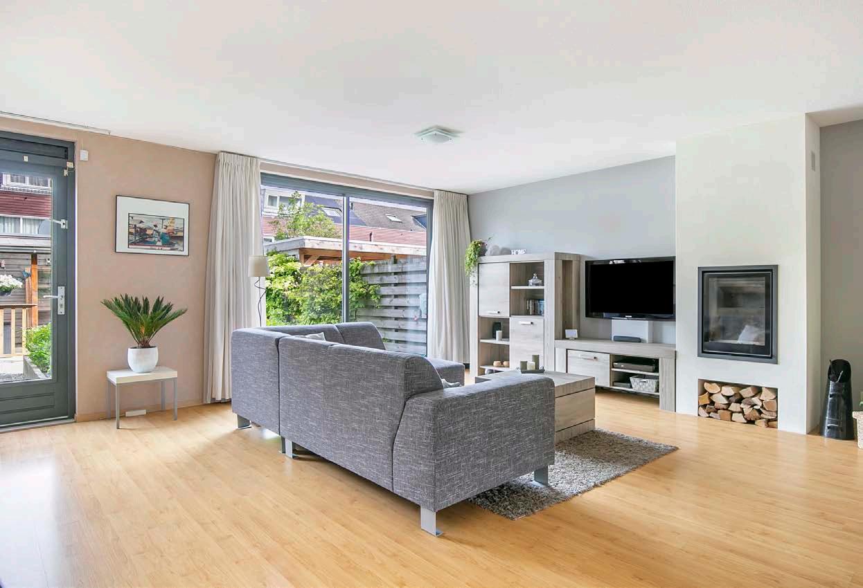 Je komt binnen in de ruime en lichte woonkamer, die uitzicht biedt op de prachtige tuin. De grote raampartijen zorgen voor veel natuurlijk licht. Met de sfeervolle haard, behang op de wanden en een laminaatvloer heb je hier de perfecte basis voor jouw nieuwe thuis. De ruimte biedt genoeg plaats voor een comfortabele zithoek en een eettafel. De schuifpui geeft je direct toegang tot de tuin, waardoor je in de zomer eenvoudig een verlengstuk van de woonruimte kunt maken.