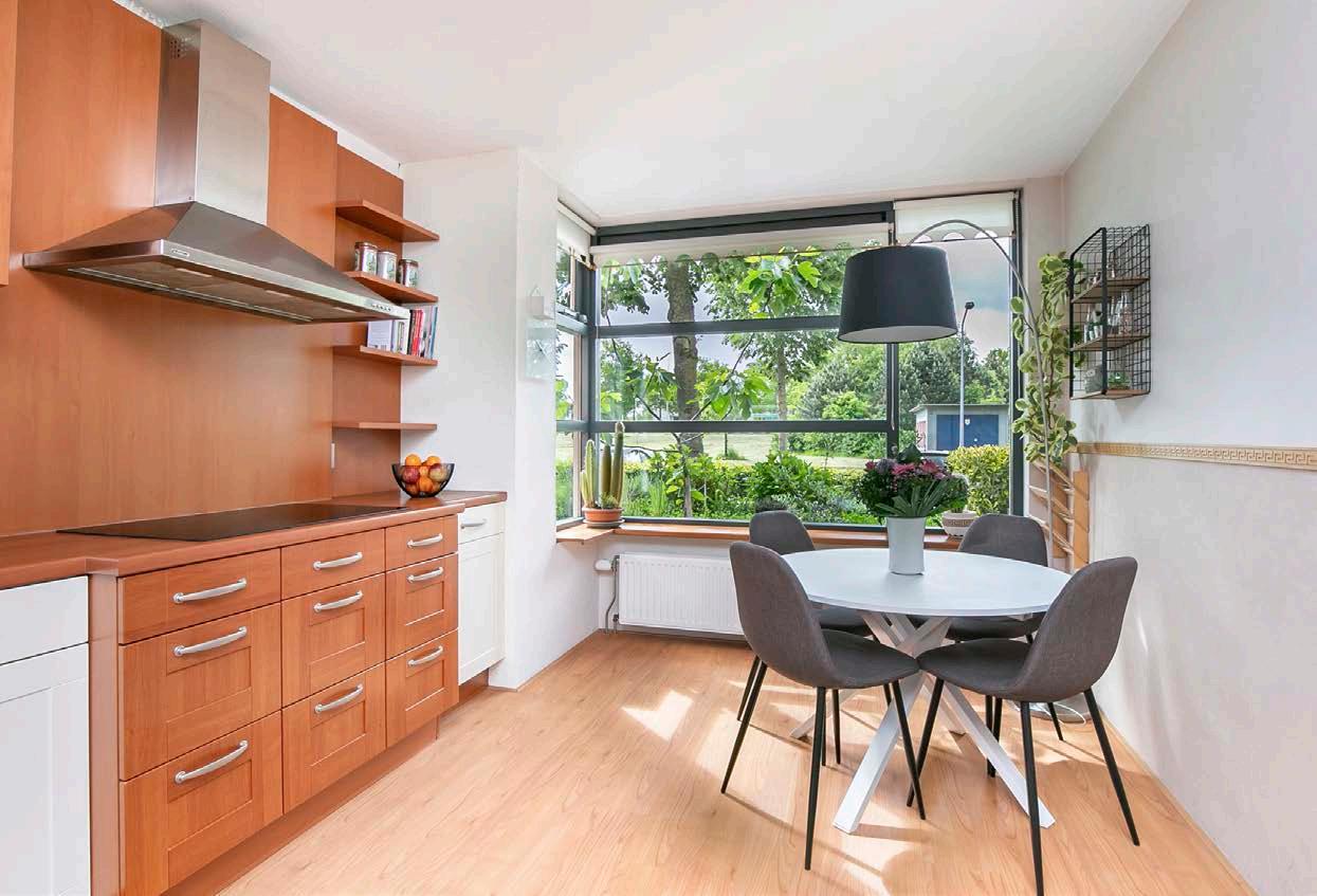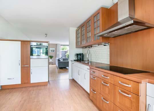 Door de grote raampartijen geniet je van het vrije zicht aan de voorzijde. Deze ramen geven tevens veel natuurlijk licht, wat het geheel heel sfeervol maakt. In deze keuken is ook aan bergruimte geen gebrek. Zo zijn er diverse kasten en lades waar je je potten, pannen en andere keukengerei in kwijt kunt. En dan hebben we het nog niet eens gehad over de inbouwapparatuur. Zo ben je voorzien van een 4 pits inductiekookplaat, ingebouwde koelkast, oven, vaatwasser en een afzuigkap.