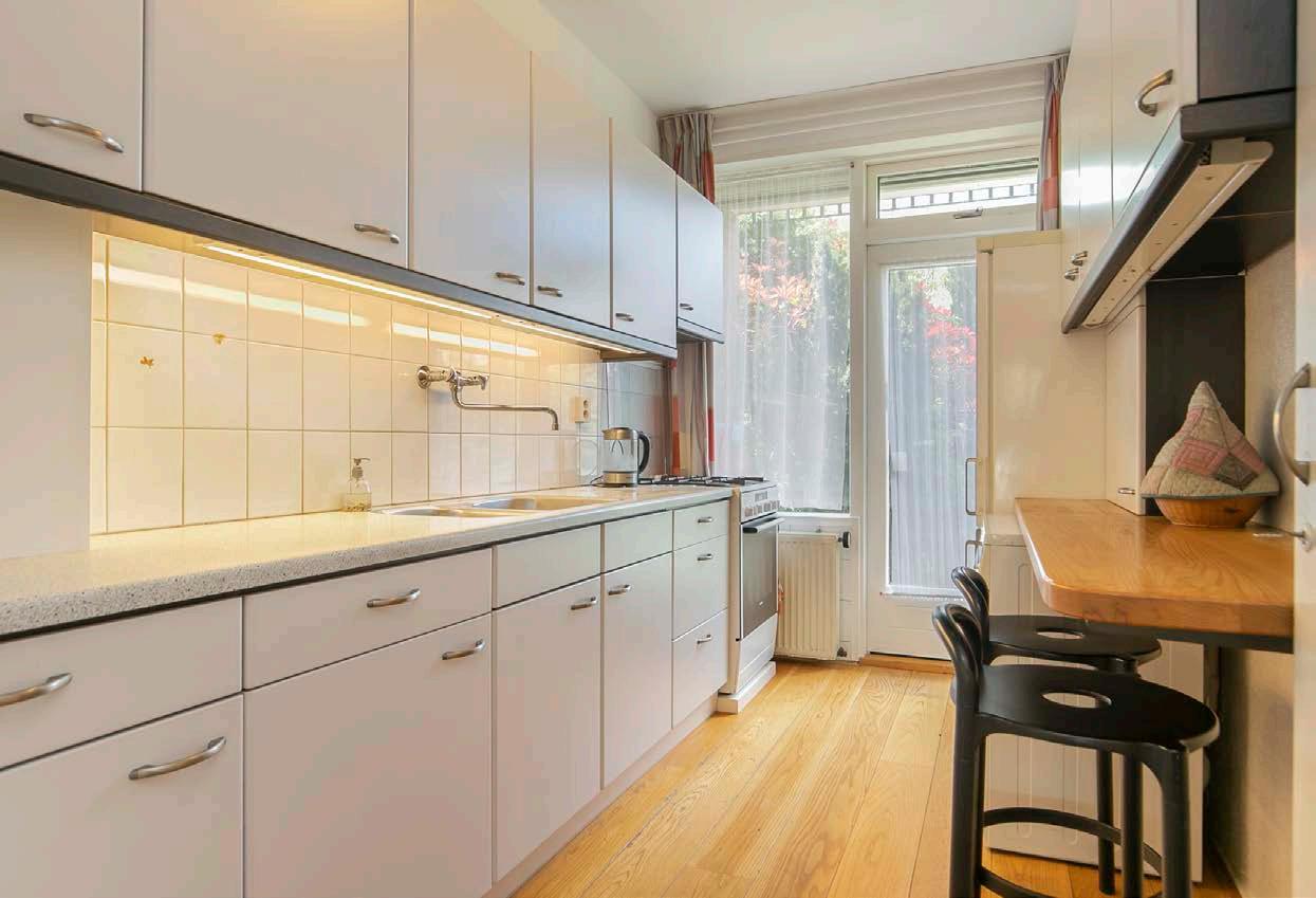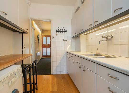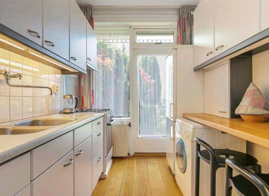 Vanuit de gang loopt u de keuken in. De keuken is gedateerd, maar functioneel ingericht. Ook de aansluiting voor het witgoed bevindt zich hier. Verder is de warmwatervoorziening in de keuken gesitueerd, deze is fijn in een keukenkast weggewerkt. Zowel vanuit de woonkamer als vanuit de keuken heeft u toegang tot de tuin.