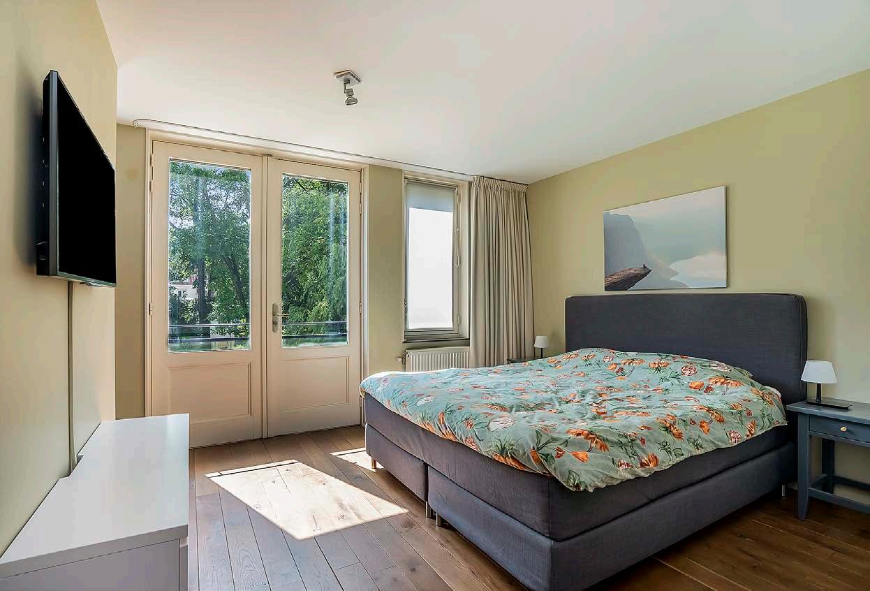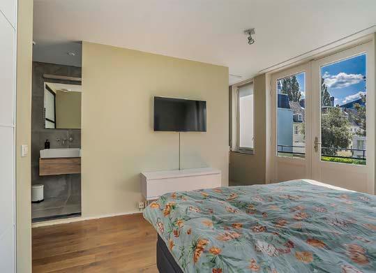 De stalen taatsdeur in de hal verleent toegang tot de slaapkamer aan de achterzijde van de woning. De slaapkamer is van ruime afmetingen en heeft openslaande deuren naar een Frans balkon op het zuidwesten.