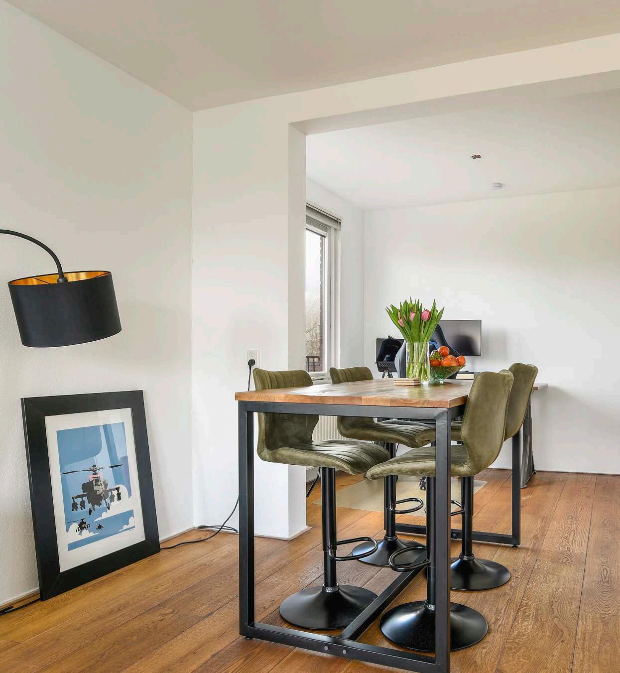Zodra je de woonkamer binnenkomt word je positief verrast door de aangename hoeveelheid daglicht. Daarnaast is de ruimte afgewerkt met lichte, neutrale wanden en een laminaatvloer waardoor je over een goede basis beschikt waarin je met verschillende interieurstijlen binnen no-time een fijn nieuw thuis realiseert.