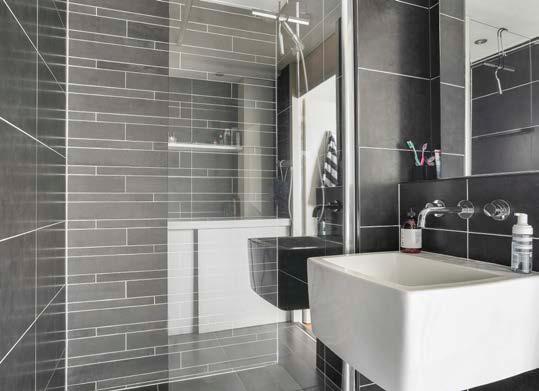 De badkamer is is volledig betegeld en heeft een verzorgde en moderne uitstraling. De indeling bestaat uit een inloopdouche en een wastafel. Het toilet bevindt zich in een separate ruimte. De cvinstallatie en de witgoedaansluitingen bevinden zich in de inpandige bergruimte.