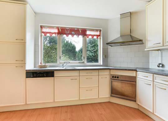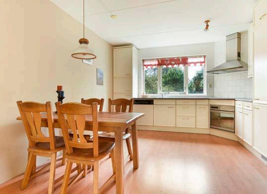 Kom verder naar de open keuken aan de voorzijde van de woning. De keuken is geplaatst in een L-op stelling en ingericht met een gaskookplaat, oven, koel-/vriescombinatie en een vaatwasser. Tijdens het koken bieden de ramen zicht op de voortuin en de straat.
