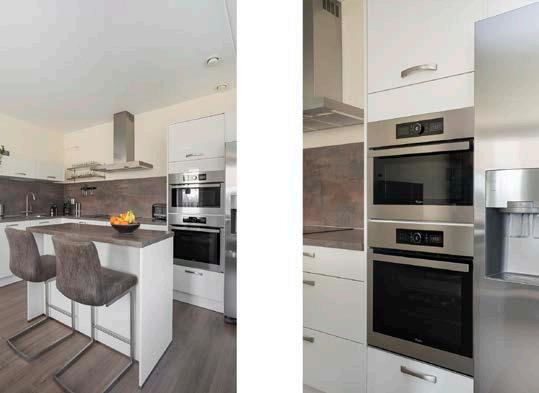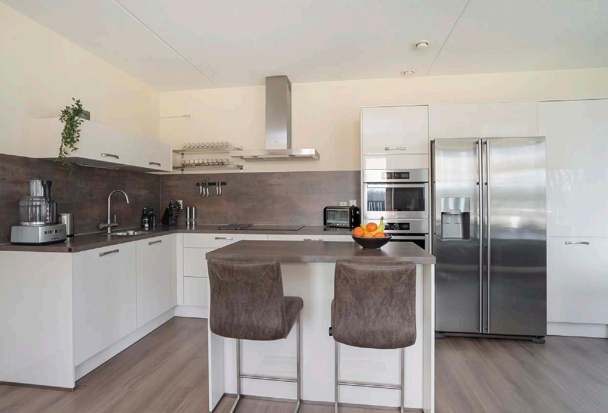 De open keuken (2016) biedt voldoende ruimte om te koken en te entertainen, perfect voor een avondje gezellig dineren met vrienden en familie. Het moderne geheel, bestaande uit een royale hoekopstelling en eiland met bar-element, is uitgerust met een inductiekookplaat, afzuigkap, oven, magnetron, vaatwasser en een losse Amerikaanse koelkast.