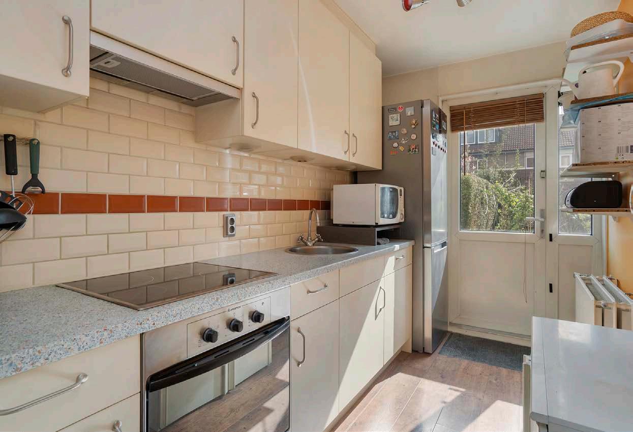 De keuken is efficiënt ingedeeld met een keramische kookplaat, afzuigkap en oven. De achterdeur verleent toegang tot de tuin. Zo kun je jouw zelf bereide maaltijden op mooie dagen gemakkelijk naar buiten serveren en lekker in de zon opeten.