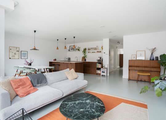 Elke dag genieten we van onze ruime, lichte Scandinavisch woon- leefkeuken. Op maat gemaakt van duurzaam bamboehout, met een extra diep aanrechtblad. Met - vanaf de lente - uitzicht op de groene blaadjes van de boom in de binnentuin.