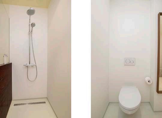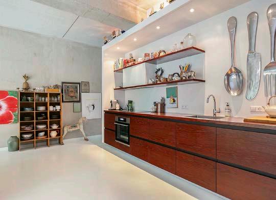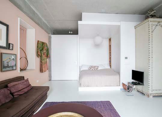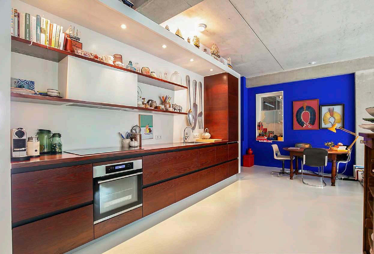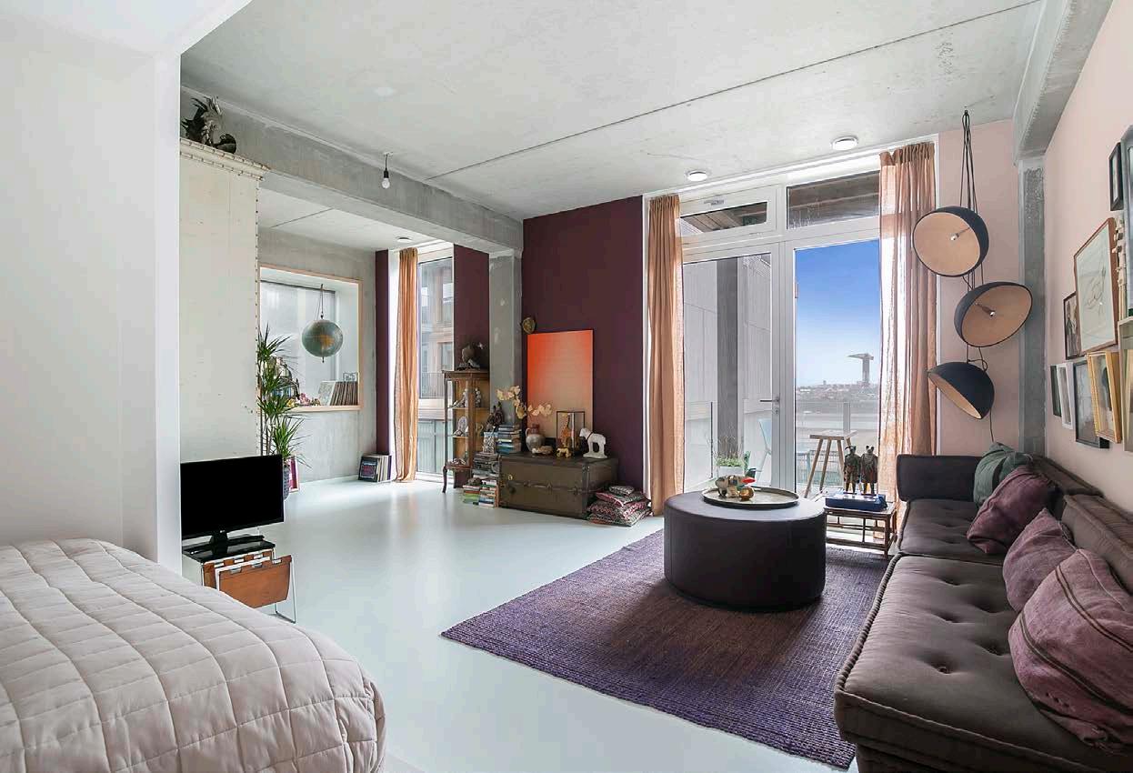 De buitenmuren van beton, niets aan gedaan. De keuken, wc, inloop kasten en de badkamer en het bed in een mooi op zich zelf staande box gebouwd. Het licht is echt mooi, s’ochtends de zon aan de voorkant en dan voel je echt de loft, het niet Nederlandse. Het gebouw heeft echt goeie buren, de buurt heeft hele leuke winkels en het lekkerste brood. Mooiste zonsondergang aan de achterkant