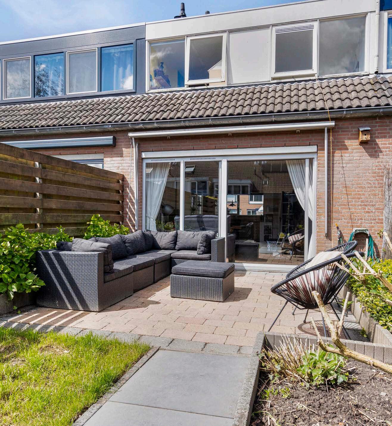 De achtertuin is fijne plek waar je de hectiek van het dagelijks leven even vergeet. Het is een plek waar je de natuur kunt voelen, ruiken en horen. Met een terras, bestrating, een deel gras en een grote houten berging is deze tuin de perfecte plek voor zowel ontspanning als activiteit. Hier kun je tuinieren, spelen met de kinderen of genieten van een goed boek in de zon. De berging biedt voldoende ruimte voor fietsen, tuinspullen en speelgoed, waardoor de tuin altijd een uitnodigende en opgeruimde ruimte blijft. Het is een verlengstuk van je woonkamer, een extra kamer in de open lucht, waar je de seizoenen intens beleeft en waar elk moment een moment van plezier kan zijn.